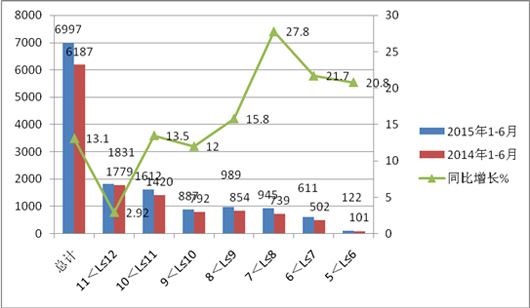 根据国家车管部门的上牌数据,2015年1~6月,5米以上CNG客车共计销售6997辆,比2014年同期的6187辆多出810辆,增幅为13.1%,高出同期客车市场的增幅,成为推动2015年1-6月客车市场增长的一个重要因素。按长度段划分销量如下: