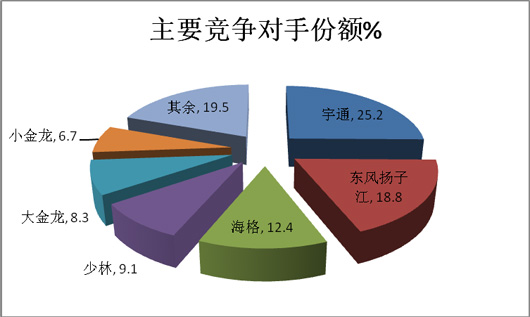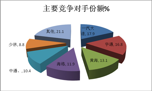 从上图可知,宇通客车占据18.9%的市场份额,其次是海格客车占据16.1%,再次是大金龙12.1%,第四是小金龙11。1%,属地企业福田占据了8.9%的市场份额,其余品牌占据了22.8%的市场份额,可见客车盟主宇通在华北市场占据优势地位,其次属地福田也占据了一定地利优势。