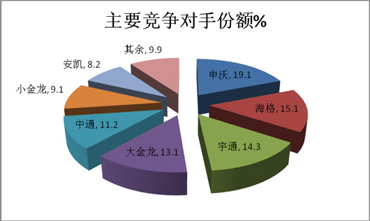 从上图可知,在华东市场,申沃客车占据19.1%的市场份额,其次是苏州金龙客车占15.1%,再次是宇通客车占据14.3%,第四大金龙客车占据13.1%,第五是小金龙,再就是中通和安凯,其余品牌占据了9.9%的市场份额,可见属地企业上海申沃在华东市场占了地利地位。