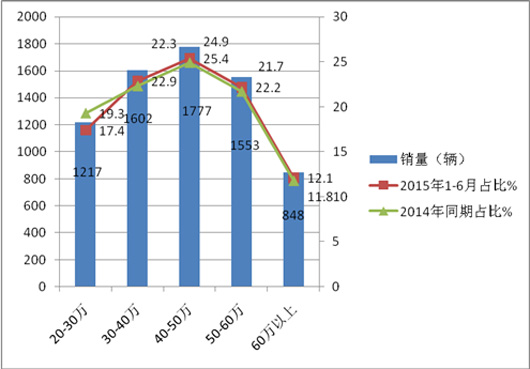 特点四、40-50万和30-40万两价格区间,是CNG客车销量最大的两个主力区段,且同比均有加大趋势,50-60万区间销量占据第三,其余区间销量较少,60万以上高端销量呈现增加趋势,20-30万低端出现下滑迹象,销量分布出现了“两头小,中间大”的市场迹象----按价格区间分析2015年1-6月5米以上CNG客车销量结构