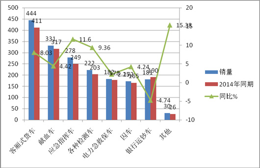 根据市场调研,2014年国内客车专用车的市场保有辆大约在13000辆左右。2014年的市场需求量为3200辆。其中需求量最大的是物流、广告行业的客厢式货车,2015年1-6月客车专用车市场销售及2014年同期按种类需求数量如下表:
