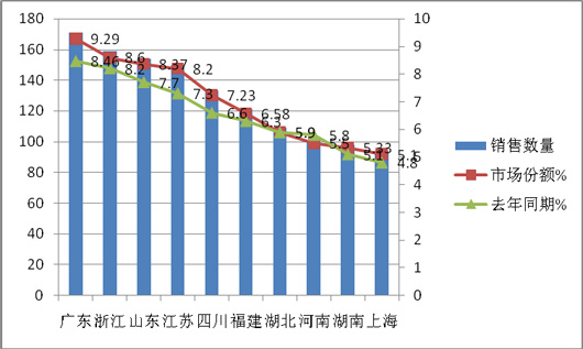 第三、前10名市场的集中度比去年同期提高了近4个百分点,且广东、江苏、山东、浙江等重点区域的市场份额比去年同期均有所提高。而河南、湖南等却比去年同期有所降低。