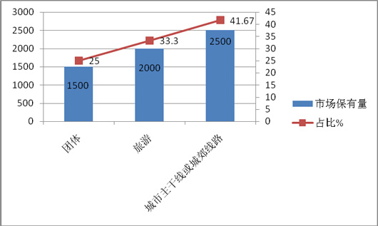 根据专家调研,目前每年中国客车市场对MPB客车的需求量大约在1000多辆,约占每年大中型客车市场需求0.6-0.7%的比例.MPB团体客车主要运行在运距为30-80公里的大中城市的厂矿企业之间,或大城市的卫星城到主城区之间,目前的目标市场主要集中在浙江、江苏、上海、北京、天津等经济发达的地区。具体的说,MPB旅游客车主要是运行于大城市到郊县的旅游景点之间,运距大约在30-100公里之间。目标市场主要集中在江苏、云南、辽宁、陕西、北京、四川等具有丰富旅游景点的地区;MPB城市客车巴士主要运行在大城市的主要干线路和城郊线路,运距一般在50-100公里,目标市场主要集中在北京、上海等大城市。