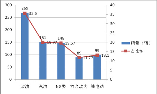根据市场调研,2015年1-6月累计销售MPB客车756辆,按发动机种类划分,销量结构如下: