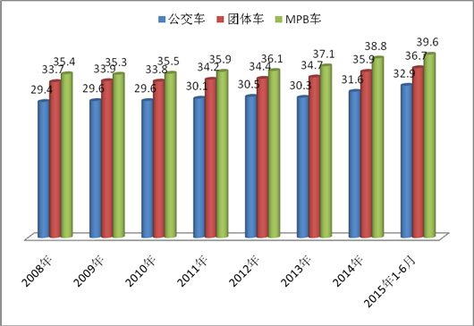 根据有关统计数据获悉(以10米5长度的车型为例来说明),一辆10米5左右的MPB的平均价格一般要比同类型的公交车平均价格要高出6万元左右,比同类型的团体车要高出2万元左右。下表是(以10米5车型为例)统计的2006-2015年1-6月近8年来的MPB、公交车、团体车的平均价(单位:万元)格比较: