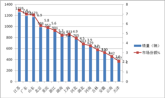 上图表显示,2015年1-6月前15名新能源客车销售区域共计销售新能源客车12037辆,占据总销量的70.8%,其中江苏区域市场份额最大,其次是山东区域,再次是广东区域。可见,重点区域的市场集中度较高,其余15个区域只有30%不到的市场份额。