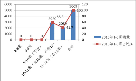 (一)2015年1-6月插电式混合动力客车按长度划分销量结构分析(来自出厂合格证发放数据统计)---10-11米插电式混合动力客车车型销量最大,11-12米销量第二,其余长度段销量为零