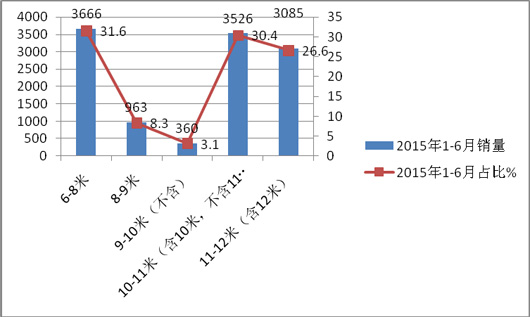 根据最新客车出厂合格证统计数据显示,2015年1-6月份,国内共销售6米以上插电式混合动力客车5009辆,按长度划分销量结构如下表: