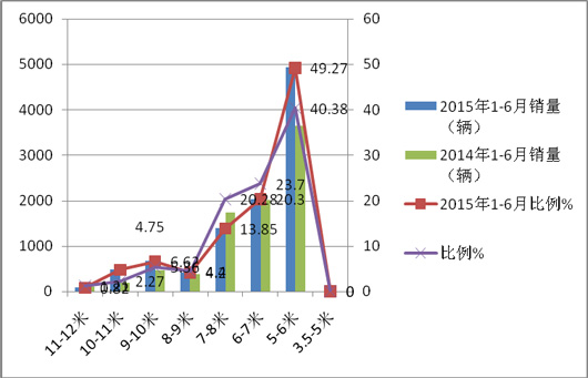 特点六、5-6米逐渐成为2015年上半年校车市场的主力车型,占据的市场权重接近校车市场的半壁江山