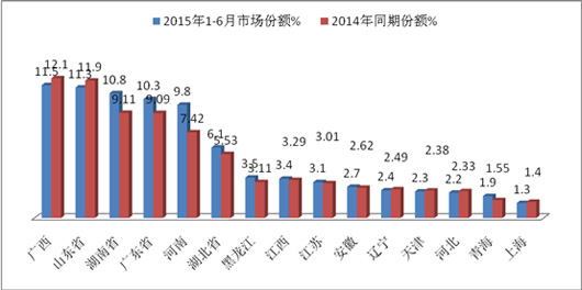 2015年1-6月主流企业校车销量分析---1-6月校车销售10360辆,比2014年同期的8751辆增长18.4%;宇通销量最大,销售3082辆,占据了校车市场29.75%的市场份额,比2014年同期32%的份额下降近2.3个百分点,前15名主流企业效率上升17.56%,但集中度却下降了0.67个百分点