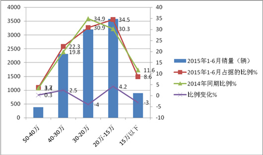 2、销量比例最大的区间是15万-20万,比例占据了34.5%,而2014年同期的比例为30.3%,同比增大了4.2个百分点;其次是20万-30万,占据的比例为30.9%,2014年同期为34.9%;销量比例也减少了4个百分点,也是减少最多的价格区间。