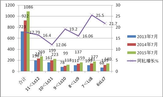 二、按长度段划分,2015年7月LNG客车销量结构分析—7-8米增幅最大,10-11米增幅最小,各长度段增幅均为正值