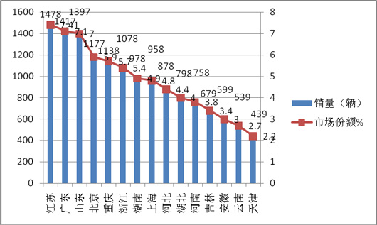 上图表显示,2015年1-7月前15名新能源客车销售区域共计销售新能源客车14311辆,占据总销量的71.7%,其中江苏区域市场份额最大,其次是山东区域,再次是广东区域。可见,重点区域的市场集中度较高,其余15个区域只有29%不到的市场份额。