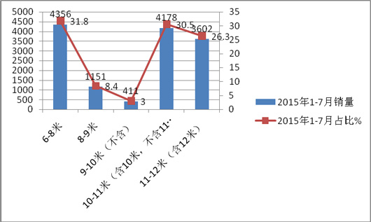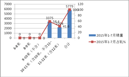 2、2015年1-7月10-11米插电式混合动力客车的销量比例为58.4%,11-12米的销量比例为41.6%。