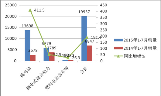 一、2015年1-7月份纯电动、插电式混合动力客车销售数据情况简述。工信部发布数据显示,7月份我国新能源汽车生产2.04万辆,同比增长2.5倍,至此,前7月我国新能源汽车累计生产达到9.89万辆,同比增长3倍。