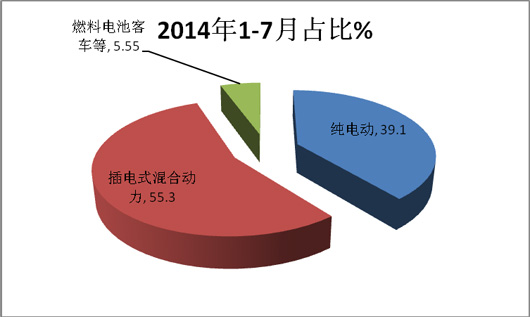 2、插电式混合动力客车2015年1-7月份占比相对2014年同期降低了近26.3个百分点。