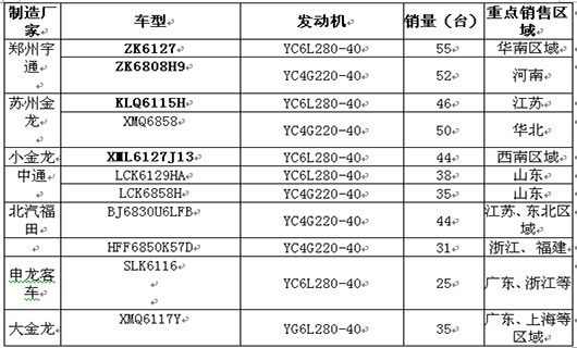 2、主流企业2015年7月销售的团体车的重点明显车型绝大部分是玉柴国IV发动机。