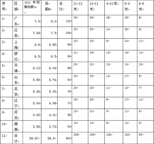 2、团体车销量最大的区域市场是目前中国客车销量第二大的省份-广东,占有的市场集中度为8.3%,而2014年同期为7.9%,同比提高了0.4个百分点,这主要与该区域经济较好、发达城市多、工厂和外资企业及高校比较多、上班的员工路途较远有关,因此需求接送职工上下班和租赁用的团体车用量就很大,这是促使该区域团体车市场发展的客观市场环境所致(比去年同期下降了近0.2个百分点),主要是因为2014年的广东区域没有重大的活动(赛事),同时由于国家货币政策导致很多企业经济效益下滑,因此购买团体车的数量减少所致。