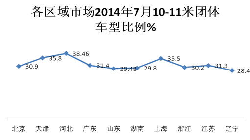 从上图表可以看出:天津、河北、上海是10-11米团体车型占据比例最高的前三位。