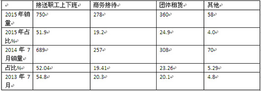 2、2015年7月用于商务接待团体用车市场占据团体车总销量的比例从2013年的20.3%逐年下降到2015年的19.2%,但下降的幅度没有接送职工上下班的团体车大。