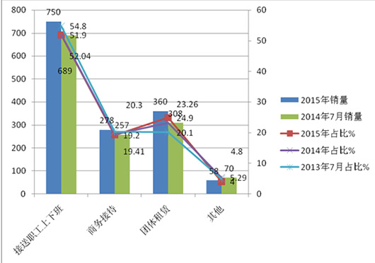 1、2015年7月,接送职工上下班始终是团体车最大的目标市场,占据团体客车总销量的比例在50%以上。但与2014年及2013年同期比,接送职工上下班的团体车比例在逐年下降,从2013年的54.8%下降到2014年的51.9%,下降趋势较明显。
