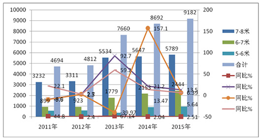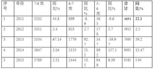 特点一:三个长度细分市场均为正增长,7-8米销量最大,6-7米增幅最大----近5年来1-8月城乡公交客车销售数据比较分析(下表数据来自近年上牌数据)