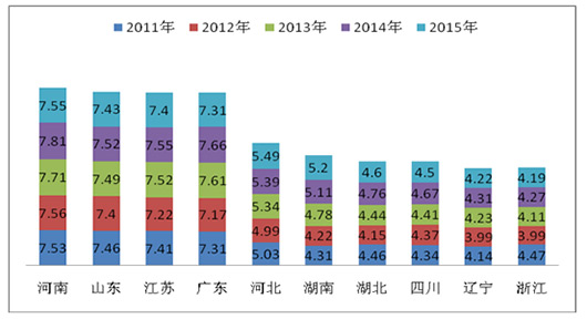 (三)重点区域中,除湖北和河南市场份额同比增长外,其余均减少,因为大部分区域在前几年基本透支了增长的势头,因此,2015年1-8月有减缓现象。