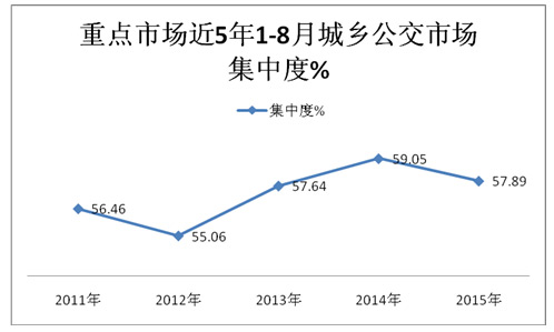 2015年1-8月河南、山东、江苏、广东、河北、湖南、湖北、四川、辽宁、浙江等销量前10名的主流区域市场城乡公交的市场占有率达到了全国城乡公交总市场的近57.9%,,同比降低了近1.06个百分点。其余年份都超过了55%,到了2015年1-8月份城乡公交车的区域垄断程度同比有所下降,其他非重点区域市场的市场机会在减少。
