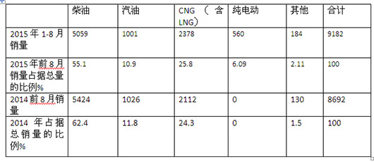 1、2015年1-8月,在6-8米城乡公交市场中,柴油占据了55.1%的市场份额,而且这种比例与去年同比在减少,减少幅度7.3%。减少幅度将较大。