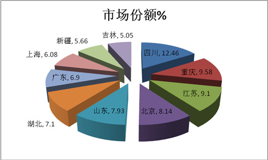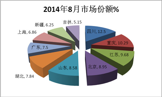 1、四川是LNG客车销量最大的区域市场销量达到121辆,占据LNG总销量的市场份额12.46%,同比集中度下降了0.04个百分点;其次是重庆区域,下降了0.71个百分点;再次是江苏市场,下降了0.58个百分点,也是2014年8月下降幅度较大的区域市场之一;第四是北京市场,第五是山东区域。但与四川区域市场的市场份额差距较大,市场集中度同比均出现不同程度的上升态势(山东除外)。