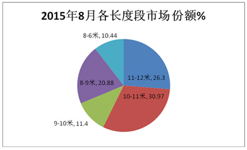 2、近3年的8月份,11-12米销量比例始终是次大的,占据团体客车的市场比例均接近或超出25%,2014年8月最大,2015年8月次大。