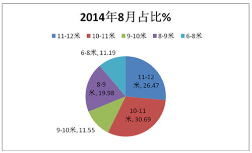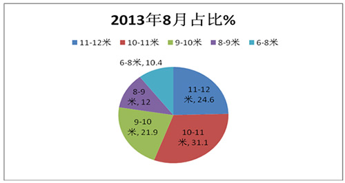 4、近3年8月9-10米段处于起伏较大的状态,2013年8月比例超过20%,而到了2014年一下跌到11.55%,2015年继续维持稳中有降的态势。