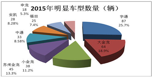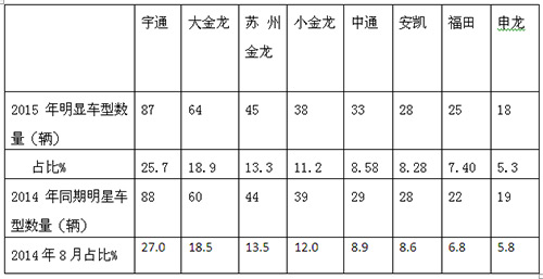 2、2015年8月份团体车市场上郑州宇通、苏州金龙、大金龙、小金龙等主要竞争对手的产品占有明显的优势,ZK6110HA、ZK6899HA、XMQ6117Y、XMQ6120C2、XMQ6858Y、KLQ6116TE3、XML6103J23、XML6127J13、XML6858J13等车型产品的销量表现不俗。