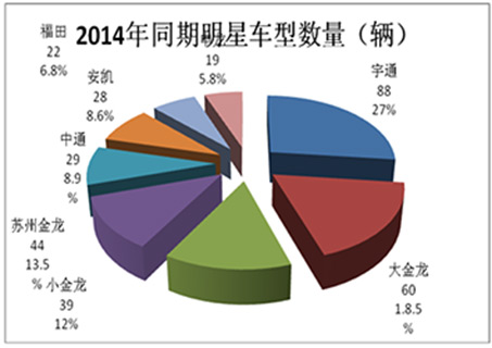 1、2015年8月宇通客车明星车型销量最多,占据主流品牌明星车型销量的25.7%,但同比稍有下降;其次是大金龙,占据了18.9%,同比稍有上升;苏州金龙占据了13.3%,同比稍有下降;第四是小金龙占据了12.0%,同比上升了0.8个百分点。总之团体客车中的明星车型主要主要是三龙一通的天下。