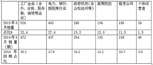 三、2015年8月份按目标用户所在行业细分对团体客车销量结构分析,表4