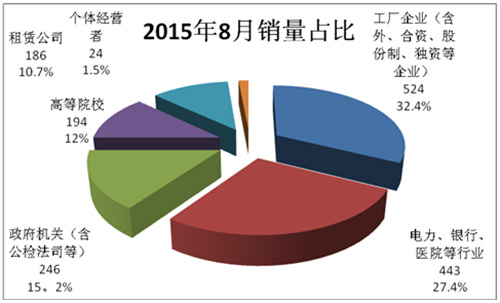 1、2015年8月份按目标客户所在行业细分,可以看出工厂企业(含外资、合资、股份制、独资等)购买的团体客车数量最多,且同比权重上升;进一步调研可知,这些企业购买团体客车主要用途是为了接送职工上下班,其次是用于接待客人等。