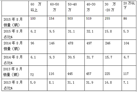 四:按价格区间划分,对2015年8月团体车销量结构进行分析