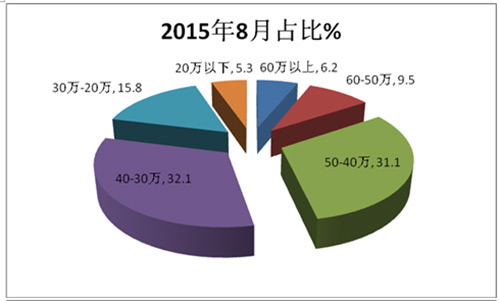 2、60—50万价格之间的团体客车车型比例同比2014年也提高了,比2013年8月夜提高了,说明团体客车市场中高档价格增多了。