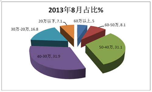 4、30万-20万的价格区间的团体客车占比与2014年同期比基本持平。与2013年8月比较也是同样的情况。