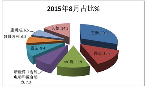 3、NG类(含CNG和LNG)发动机是2015年8月团体客车销量中权重第三大的细分市场,几乎占据了8月团体客车市场销量的十分之一强,但与2014年8月级2013年8月比较,权重在逐年提高,说明团体客车市场中也越来越重视环保和节能经济成本了。