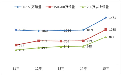 2、在2015年前三季度的高端客车市场中,价格在90-150万之间的产品,市场容量在90万以上高档客车中仍然是最大的,这一点仍然延续了近5年的惯性发展规律。尽管近5年中除2012年下降外,也呈现了一定的增长态势,但市场需求的数量也很有限,这主要与目标市场经营者的购买力和回报率等因素有关