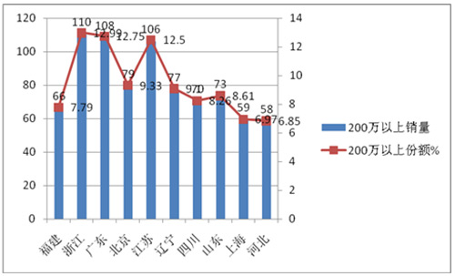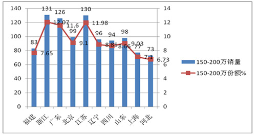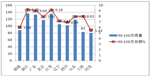 3、从细分市场来看,浙江市场是90-150万价格销量最大的区域,其次是江苏,再次是广东;同时浙江还是150-200万销量最大的区域,其次是江苏,再次是广东。浙江仍然是200万以上客车销量最大的区域,其次是广东,再次是江苏。可见。价格细分区间销量与总销量的规律分布稍有差异。