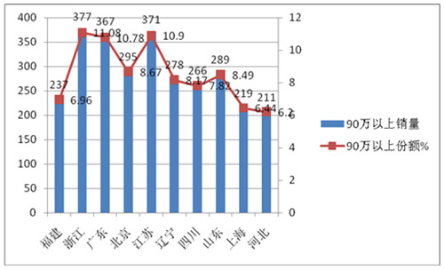 5、在2015年前三季度,浙江区域是90万以上高档客车市场中销量最大的市场,其次是江苏,再次是广东。按价格细分市场的销量分布规律与整体销量相同。