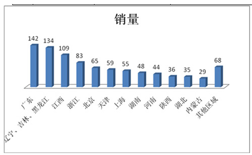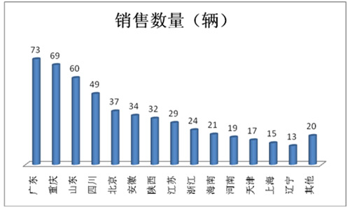 1、2015年1-9月江淮宝斯通累计销售512辆,同比增长约6%,主要销售区域分布如下: