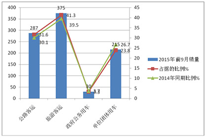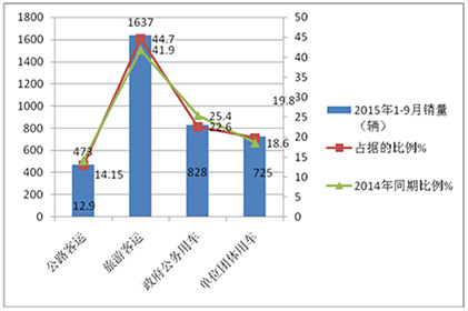 综上所述,2015年1-9月主流企业中高端考斯特车型在市场份额一定的情况下,在政府公务用车的比例下降,在旅游、团体用车市场比例上升是市场发展的必然。
