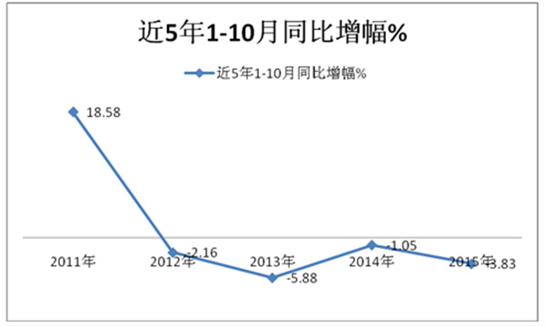 上图表可以看出,2015年1-10月份公路客车比去年同期减少4110辆,降幅为3.83%,比2011年和2012年同期的销量都少,只比2010年同期销量多,是近6年第五次连续下降的年份,可见,公路客车市场依然处于低迷状态。