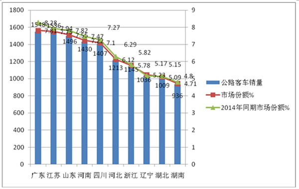 根据上牌数据统计,11-12米公路客车主要分布在广东、江苏、山东、河南、四川、河北、浙江、辽宁、湖北和湖南等十大区域市场,根据市场调研,这十大主流市场的11-12米公路客车历来占据全国的市场份额都在65-75%之间,。根据上牌数据统计,2015年1-10月11-12米公路客车共计销售19817辆,其中产品销量在前10名的全国主流区域市场列表如下: