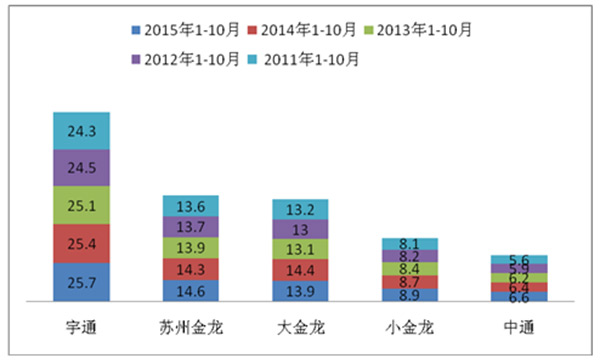 4、小金龙公路客车市场份额处于第四,在2015年1-10月出现了恢复性增长态势。