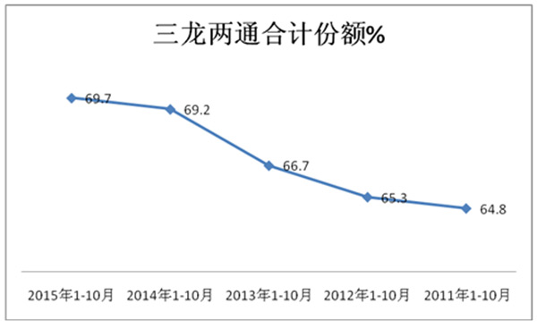 6、2015年1-10月三龙两通等主流公路客车企业的公路客车总量占据整个公路市场的集中度为69.7%,而2014年同期其集中度为69.2%,2015年1-10月市场集中度同比上升了0.5个百分点,另外近5年1-10月垄断程度在逐年加强。一方面说明三两通等主流公路客车企业是公路客车的绝对垄断者,同时其垄断地位还在加强,这也从一定程度上说明了三龙两通等强势公路客车企业强者愈强的局面正在形成,其他公路客车企业竞争压力越来越大。