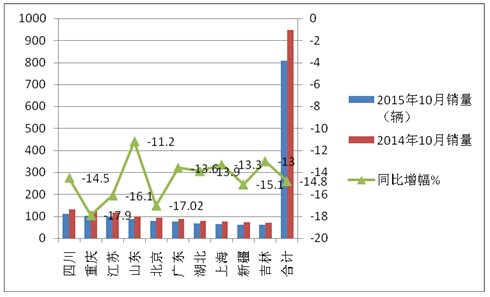 一、2015年10月份LNG客车主流销售区域流向情况分析-销量同比均下降,集中度也下降